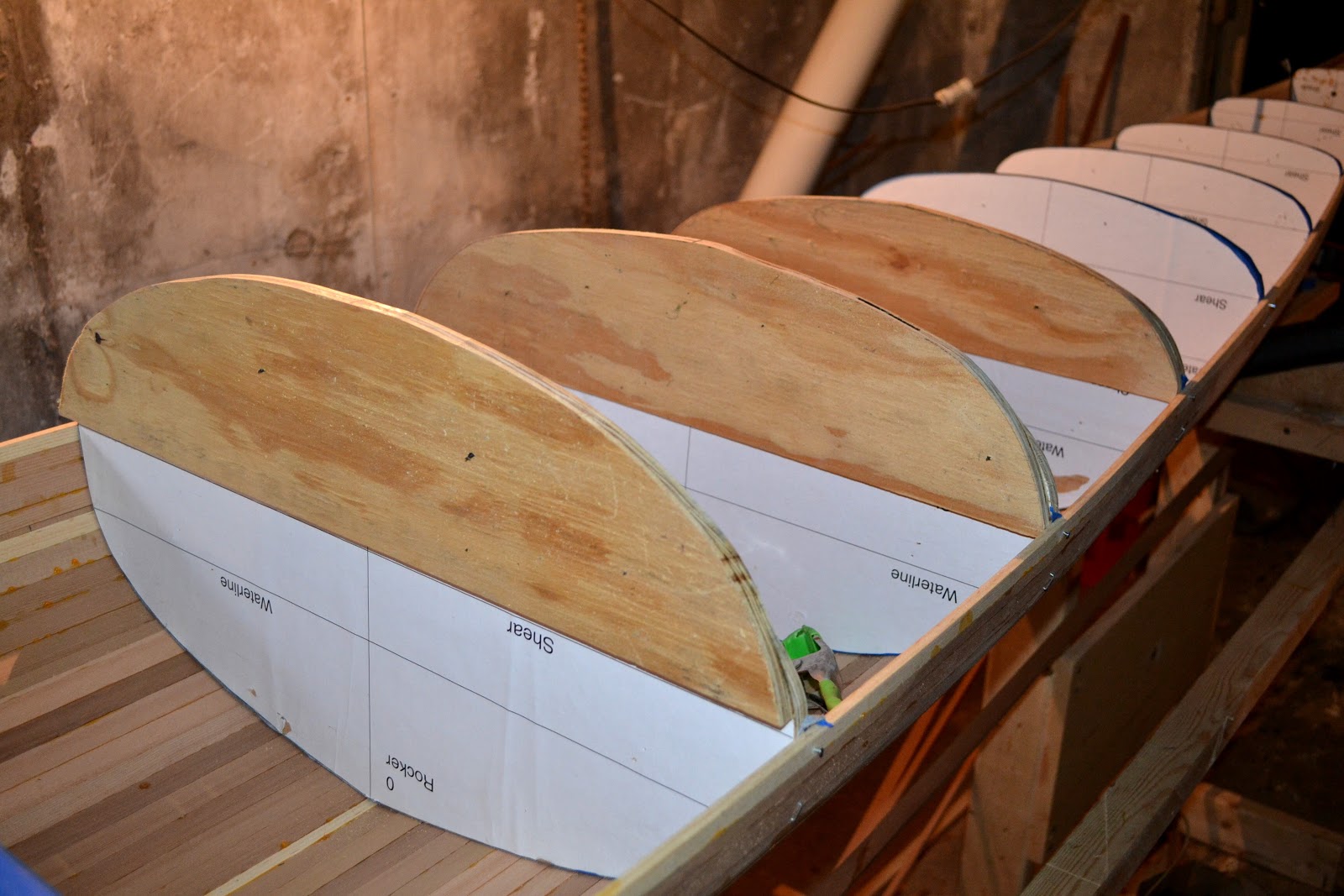 I joined two 3/8" strips together at the center line. One 3/4" strip looked almost good, but I wanted to bevel slightly on the forms that are curved. The usual array of clamps and tape.